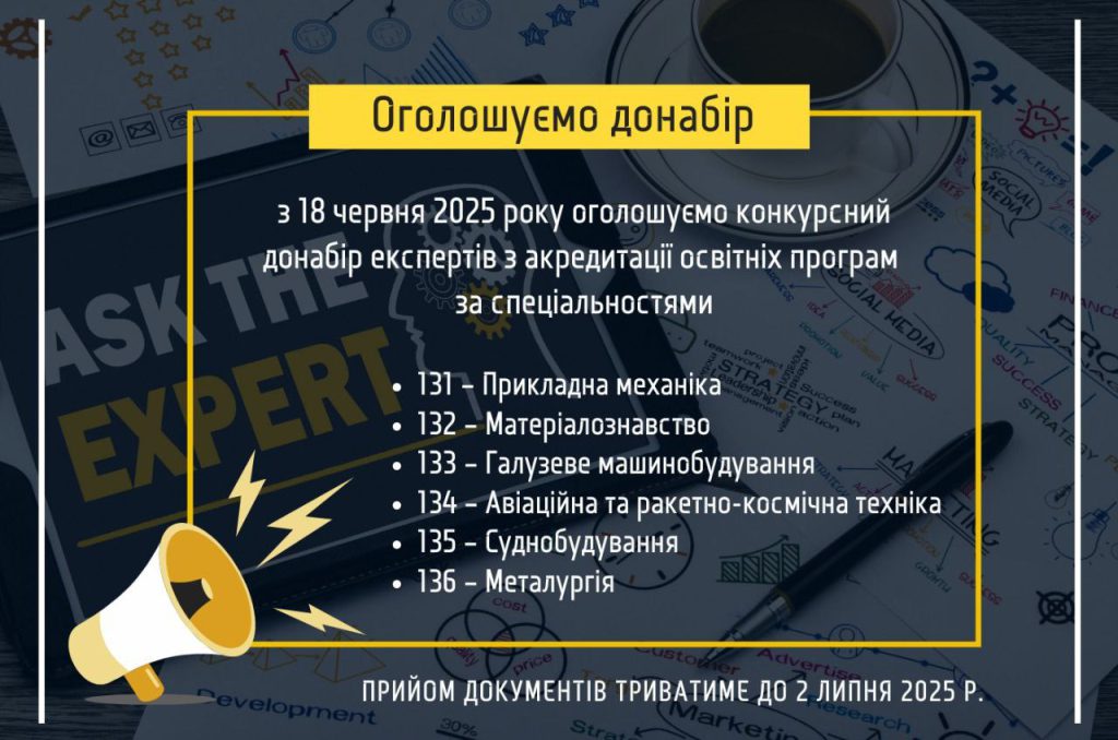 📢Оголошуємо конкурсний донабір експертів з акредитації освітніх програм з числа науково-педагогічних та наукових працівників за спеціальностями: